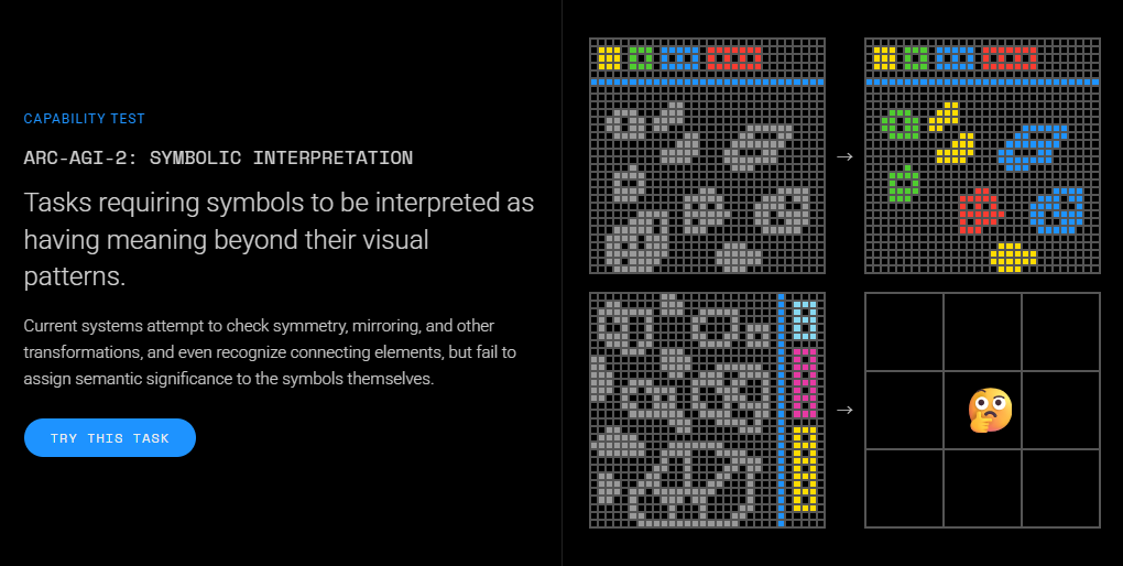 ARC-AGI-1에서 업그레이드된 ARC-AGI-2 버전에서는 위 이미지와 같은 형식의 문제가 출제된다고 한다.